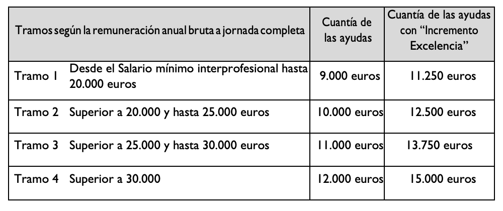 La cuantía de las ayudas irá desde 9.000 hasta 15.000 euros en base a los tramos establecidos que detallamos a continuación: